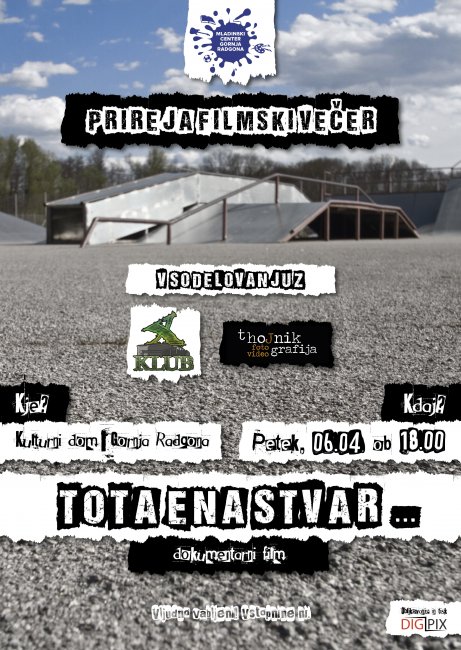 Filmski večer Mladinskega centra Gornja Radgona: dokumentarni film TOTA ENA STVAR ... - 6. aprila 2012 v Domu kulture Gornja Radgona