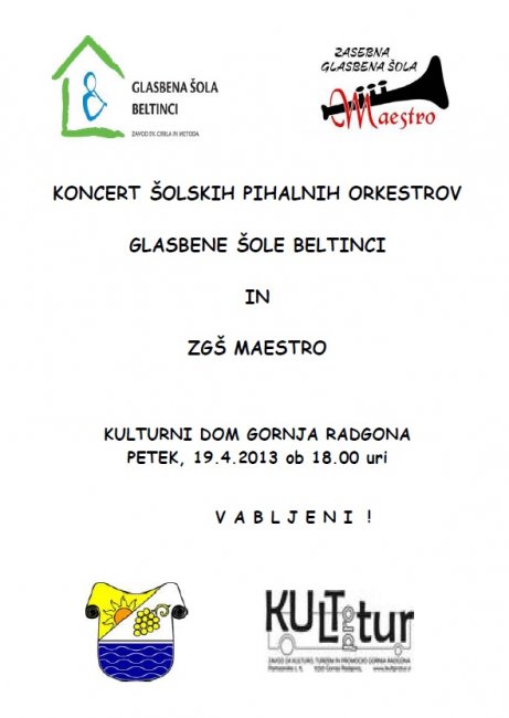 Koncert šolskih pihalnih orkestrov Glasbene šole Beltinci in ZGŠ Maestro - 19. aprila 2013 v Kulturnem domu Gornja Radgona