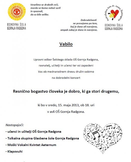 DOBRODELNI KONCERT: Resnično bogastvo človeka je dobro, ki ga stori drugemu - 15. maja 2013 na OŠ Gornja Radgona