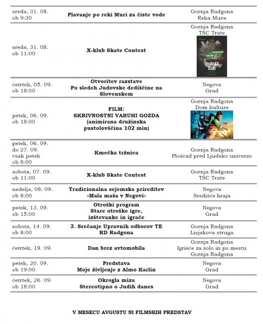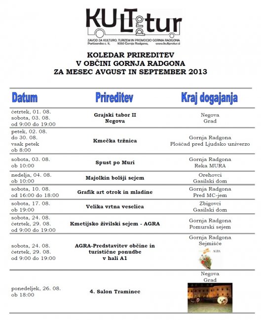 Prireditve, ki se bodo v mesecu avgustu in septembru 2013 odvijale v občini Gornja Radgona so razvidne iz priponke spodaj: