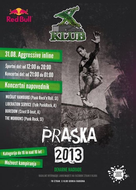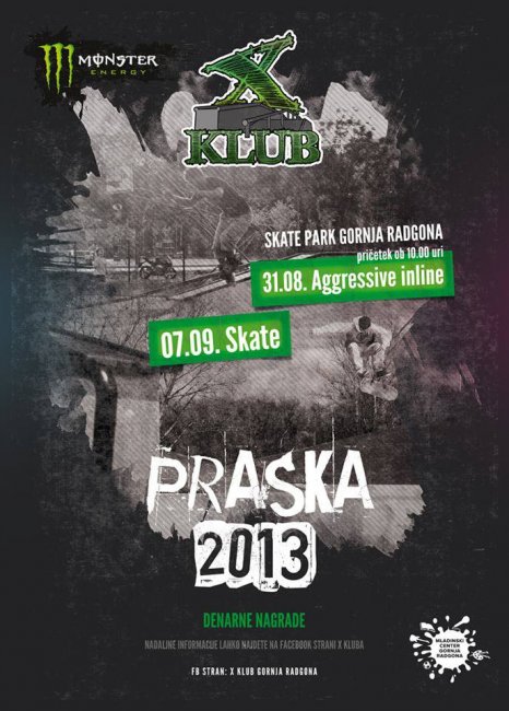 Tradicionalni mednarodni aggressive inline/skate spektakel PRASKA 2013 (Poletna Radgonska Skatersko-Kulturna Akcija): Agressive inline tekmovanje 31. 8. 2013 (športni in koncertni del) in Skate tekmovanje 7. 9. 2013 na TŠC Trate Gornja Radgona