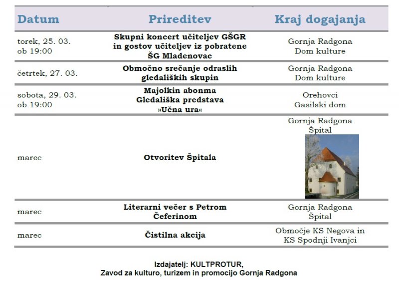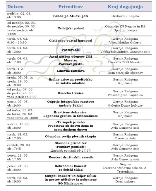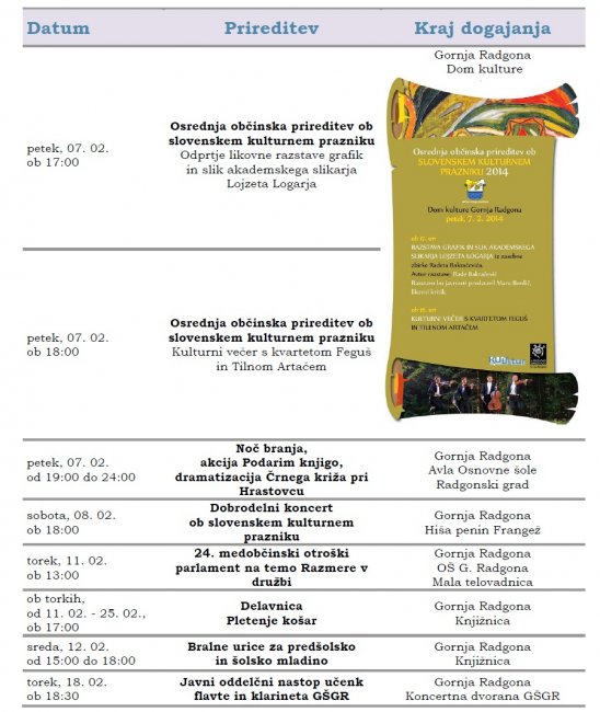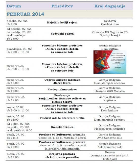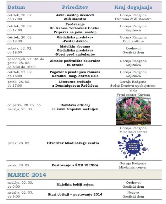 Prireditve, ki se bodo v mesecu februarju in marcu 2014 odvijale v občini Gornja Radgona so razvidne iz priponke spodaj: