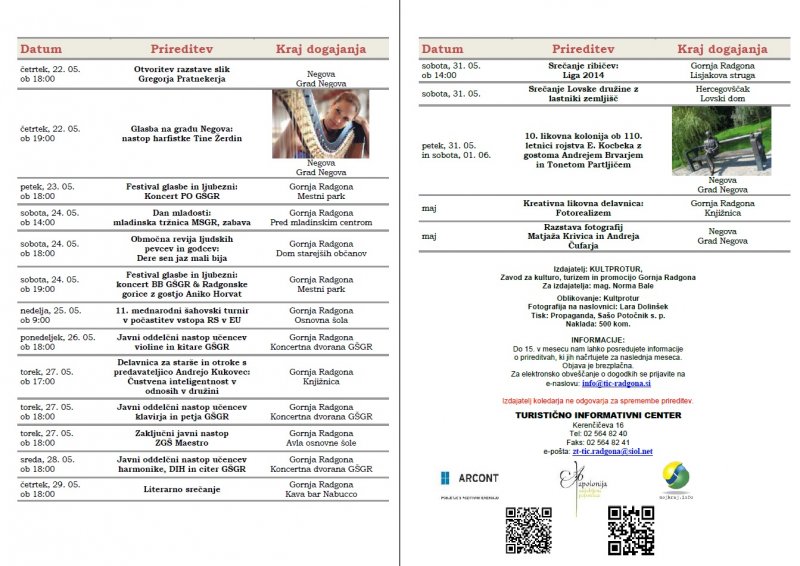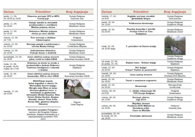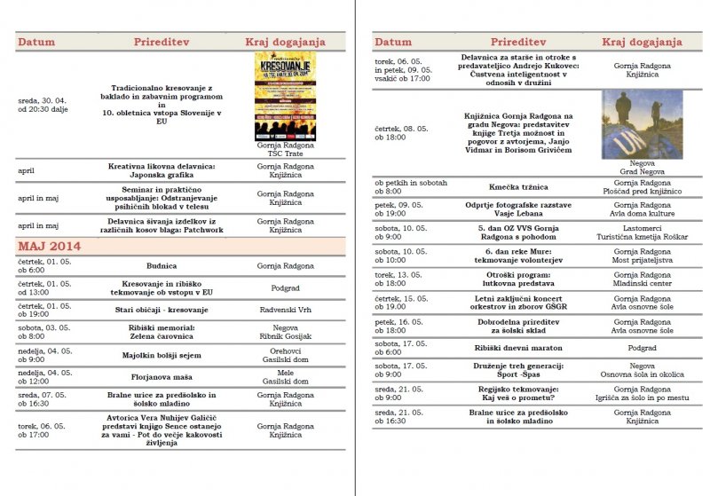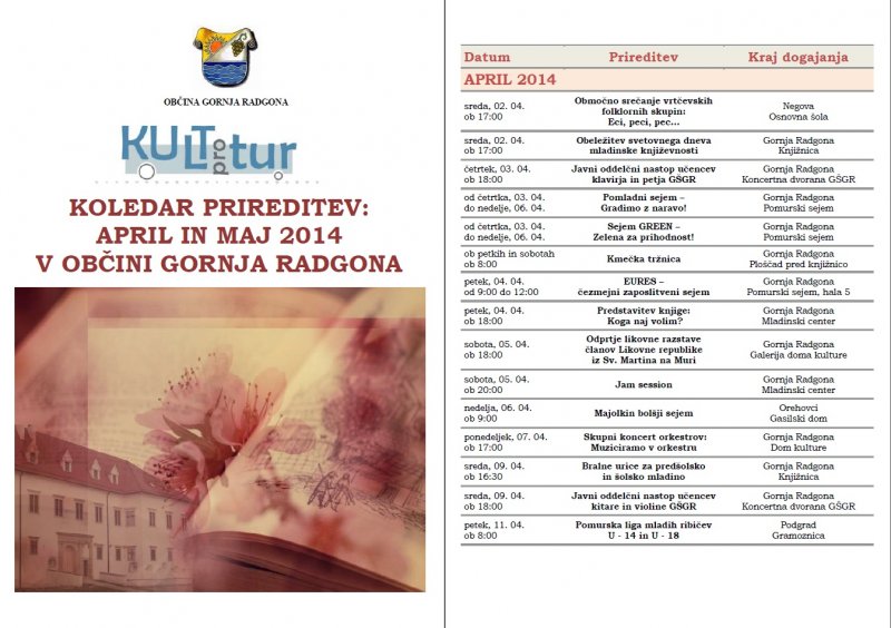 Prireditve, ki se bodo v mesecu aprilu in maju 2014 odvijale v občini Gornja Radgona so razvidne iz priponke spodaj: