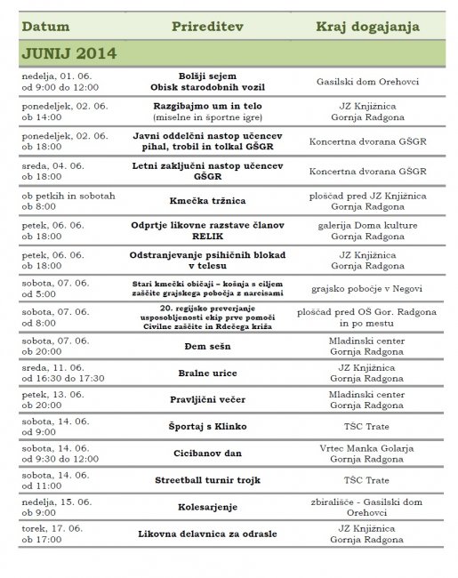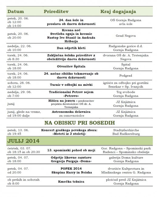Prireditve, ki se bodo v mesecu juniju in juliju 2014 odvijale v občini Gornja Radgona so razvidne iz priponke spodaj: