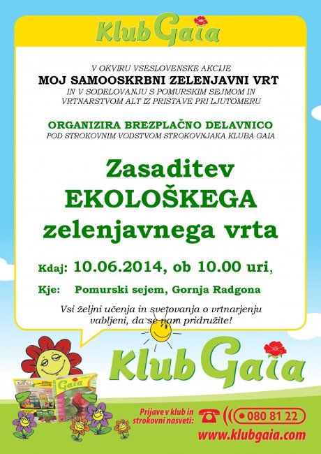 Klub Gaia v sodelovanju s Pomurskim sejmom in Vrtnarstvom Alt iz Pristave pri Ljutomeru organizira brezplačno delavnico Zasaditev ekološkega zelenjavnega vrta, ki bo v torek, 10. 6. 2014, ob 10. uri, na Pomurskem sejmu v Gornji Radgoni.