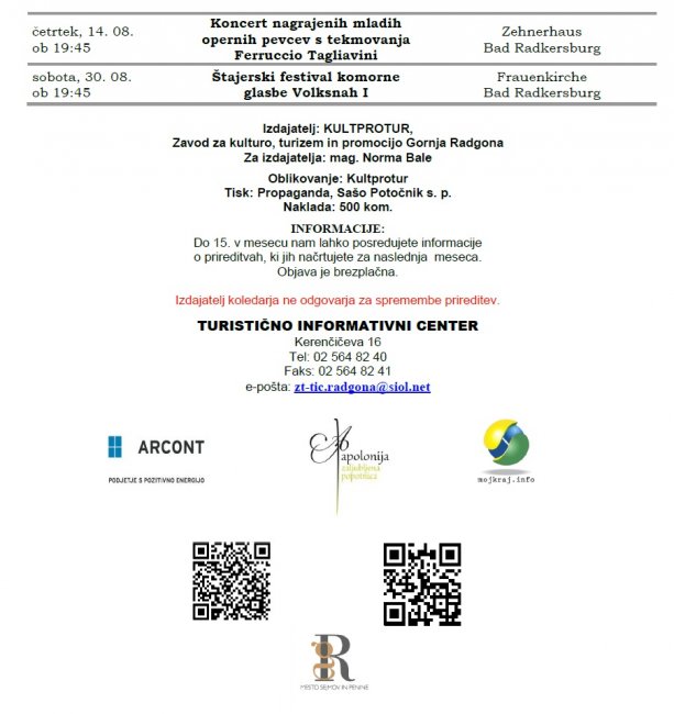 Koledar prireditev v tiskani obliki se lahko dobi v TIC-u, na občini, v Domu kulture in na drugih mestih v Gornji Radgoni.