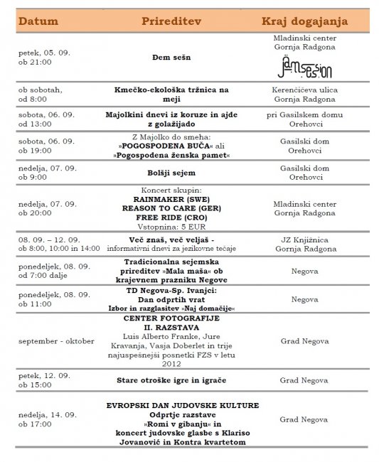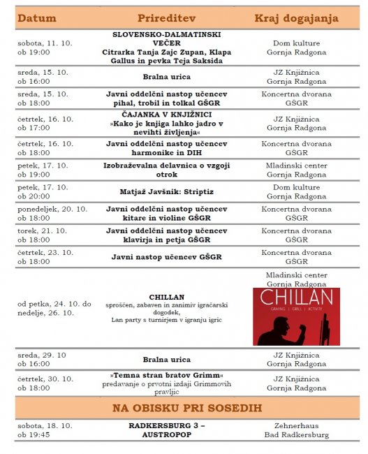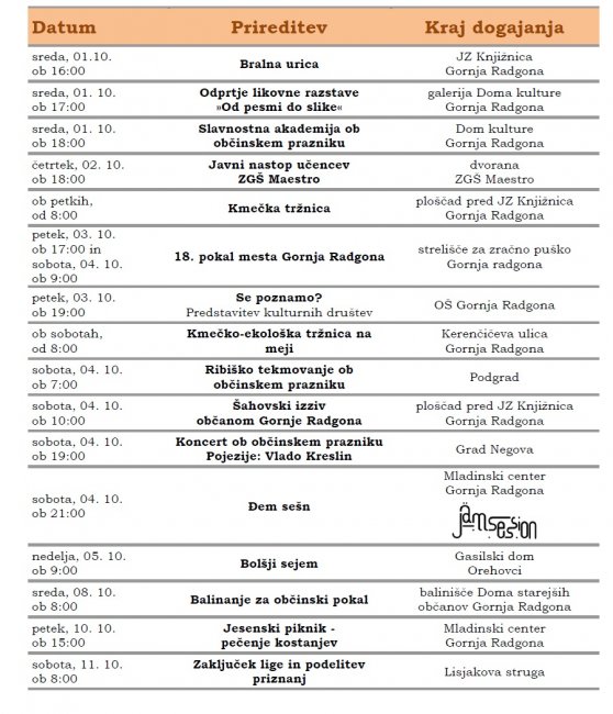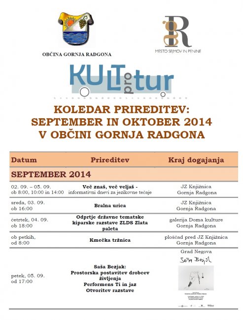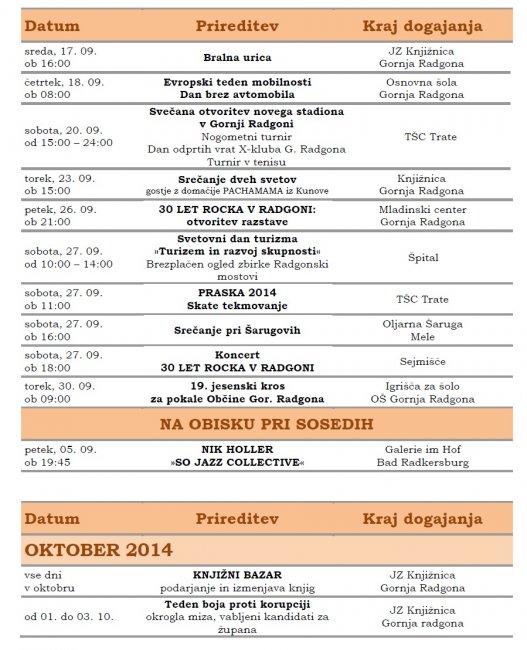 Prireditve, ki se bodo v mesecu septembru in oktobru 2014 odvijale v občini Gornja Radgona so razvidne iz priponke spodaj: