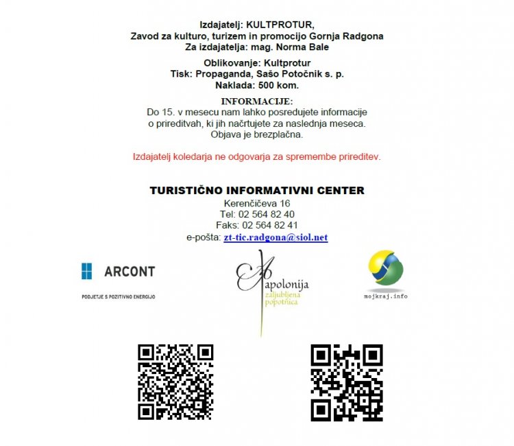 Koledar prireditev v tiskani obliki se lahko dobi v TIC-u, na občini, v Domu kulture in na drugih mestih v Gornji Radgoni.