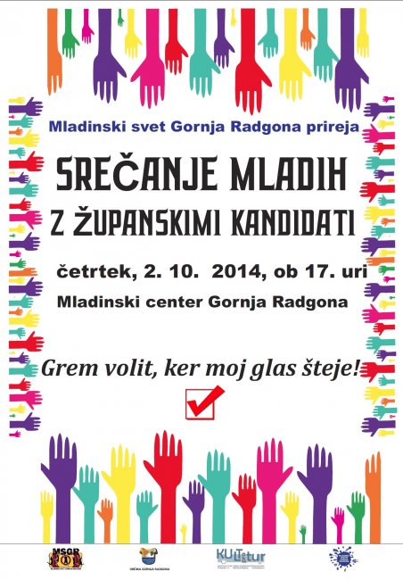 Mladinski svet Gornja Radgona prireja sproščeno srečanje mladih z županskimi kandidati in mladimi kandidati za svetnike v občinski svet. Potekalo bo v četrtek, 2. oktobra 2014, ob 17. uri v prostorih Mladinskega centra Gornja Radgona.
