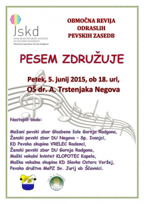 Območna revija odraslih pevskih zasedb »PESEM ZDRUŽUJE« - 5. junija 2015 na OŠ dr. Antona Trstenjaka Negova