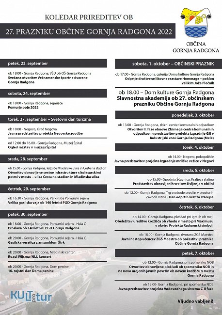 For all information on the tourist offer in the municipality, please visit the local Tourist Information Center website www.kultprotur.si/en/tic-gornja-radgona (or www.kultprotur.si/en/) or contact it via tel. no. 00386 2 564 82 40 or E-mail .