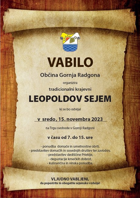 Občina Gornja Radgona v sredo, 15. novembra organizira vsakoletni Leopoldov sejem na Trgu svobode v Gornji Radgoni.