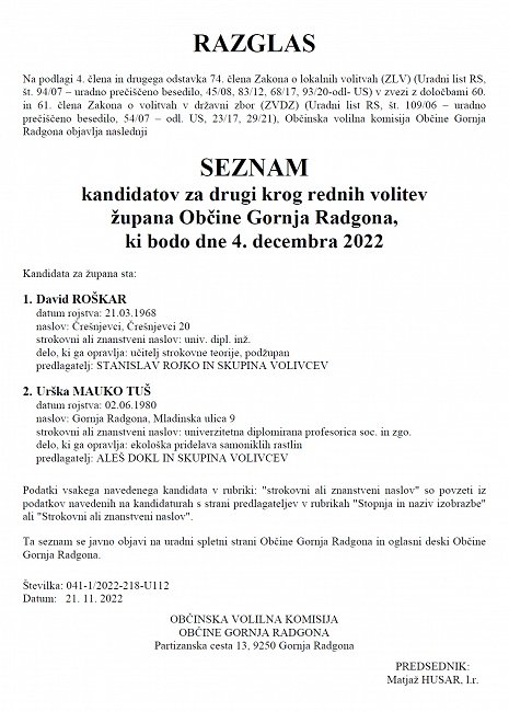 LOKALNE VOLITVE 2022: RAZGLAS - SEZNAM kandidatov za drugi krog rednih volitev župana Občine Gornja Radgona, ki bodo dne 4. decembra 2022