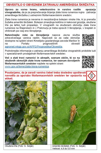 Obvestilo o obveznem zatiranju ameriškega škržatka zaradi preprečevanja širjenja zlate trsne rumenice