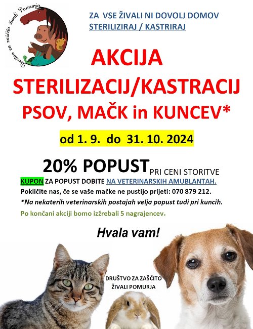 Akcija sterilizacij in kastracij psov, mačk in kuncev na vseh veterinarskih postajah v Pomurju, Moškanjcih in Ormožu - od 1. 9. do 31. 10. 2024