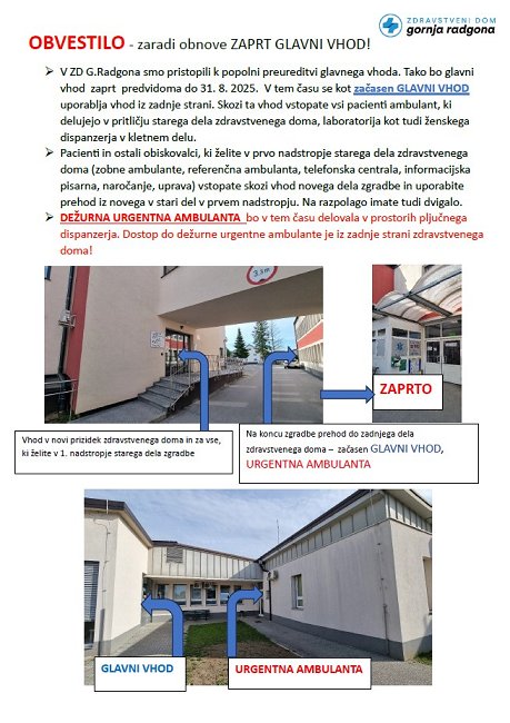 ➢ V ZD G.Radgona smo pristopili k popolni preureditvi glavnega vhoda. Tako bo glavni vhod zaprt predvidoma do 31. 8. 2025. V tem času se kot začasen GLAVNI VHOD uporablja vhod iz zadnje strani. Skozi ta vhod vstopate vsi pacienti ambulant, ki delujejo v pritličju starega dela zdravstvenega doma, laboratorija kot tudi ženskega dispanzerja v kletnem delu.