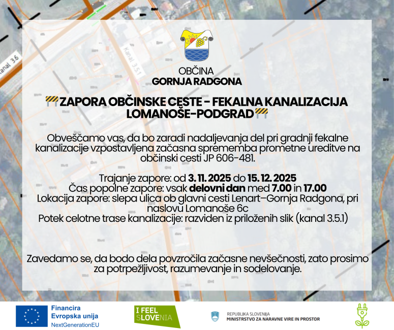 Ponovno obvestilo o zaprtju občinske ceste fekalna kanalizacija Lomanoše–Podgrad