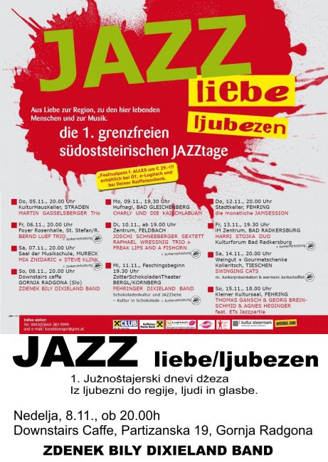 Vljudno vabljeni na 1. Južnoštajerske dneve džeza "Iz ljubezni do regije, ljudi in glasbe", v okviru katerih bo tudi koncert skupine Zdenek Bily Dixieland Band, ki bo v nedeljo, 8. 11. 2009, ob 20. uri v Downstairs Caffe v Gornji Radgoni.