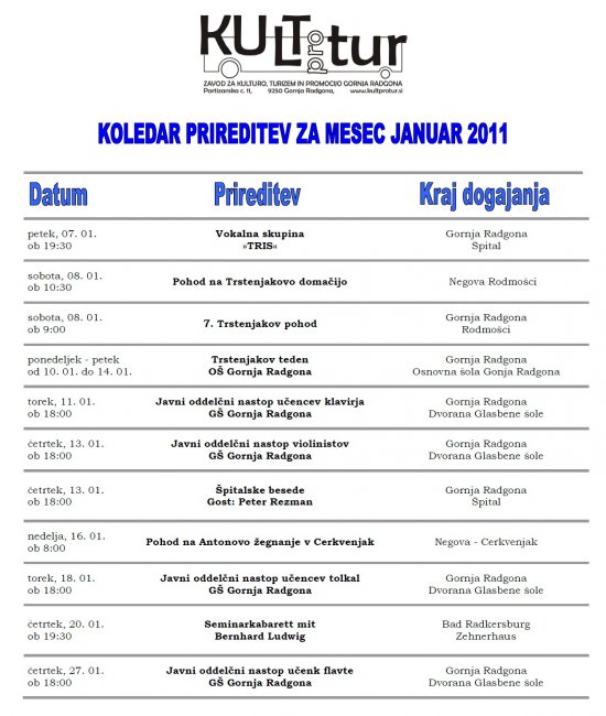 Koledar prireditev v mesecu januarju 2011