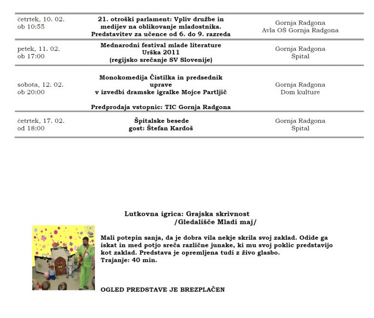 Prireditve, ki se bodo v mesecu februarju 2011 odvijale v občini Gornja Radgona in filmski program kina v Gornji Radgoni, so razvidne iz priponke spodaj: