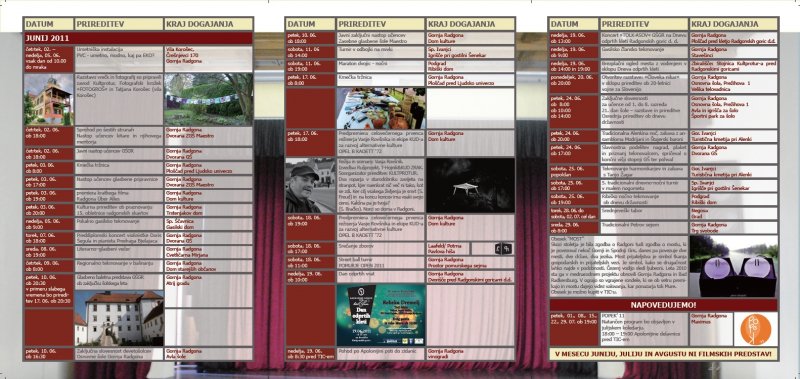 Prireditve, ki se bodo v mesecu juniju 2011 odvijale v občini Gornja Radgona in filmski program kina v Gornji Radgoni, so razvidne iz priponke spodaj: