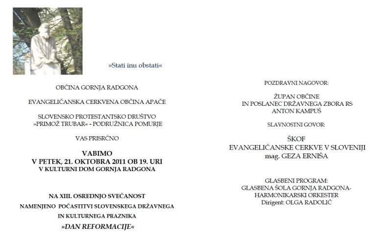 XIII. osrednja svečanost namenjena počastitvi slovenskega državnega in kulturnega praznika *DAN REFORMACIJE* - 21. oktobra 2011 v Kulturnem domu Gornja Radgona