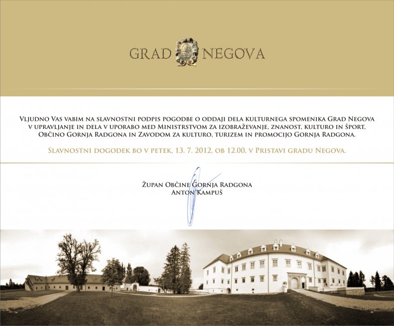 Slavnostni podpis pogodbe o oddaji dela kulturnega spomenika Grad Negova v upravljanje in dela v uporabo med Ministrstvom za izobraževanje, znanost, kulturo in šport, Občino Gornja Radgona in Zavodom za kulturo, turizem in promocijo Gornja Radgona