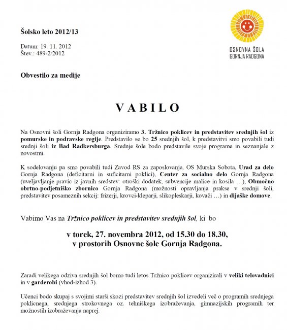 3. Tržnica poklicev in predstavitev srednjih šol iz pomurske in podravske regije - 27. novembra 2012 na Osnovni šoli Gornja Radgona