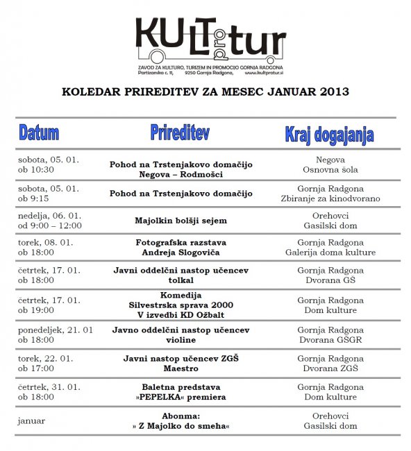 Prireditve, ki se bodo v mesecu januarju 2013 odvijale v občini Gornja Radgona so razvidne iz priponke spodaj: