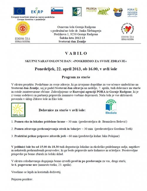 Predavanje »Poskrbimo za svoje zdravje« v okviru skupnega naravoslovnega dneva - 22. aprila 2013 v avli Osnovne šole Gornja Radgona