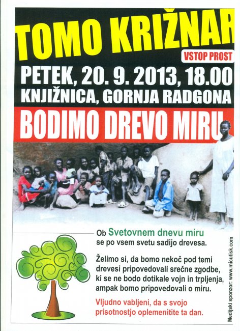 Predavanje "Bodimo drevo miru" ob Svetovnem dnevu miru: Tomo Križnar - 20. septembra 2013 v Knjižnici Gornja Radgona
