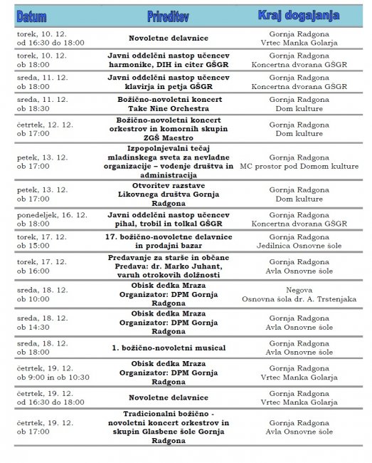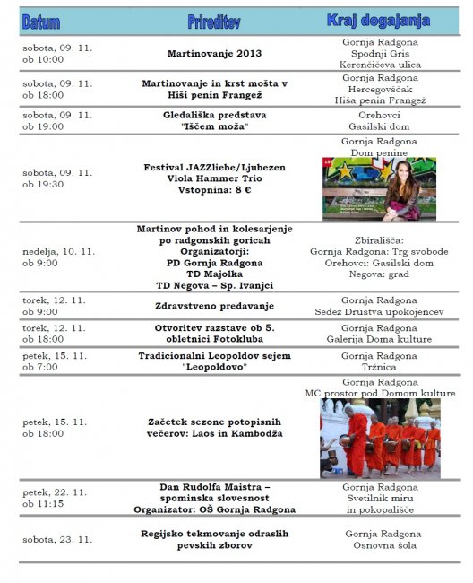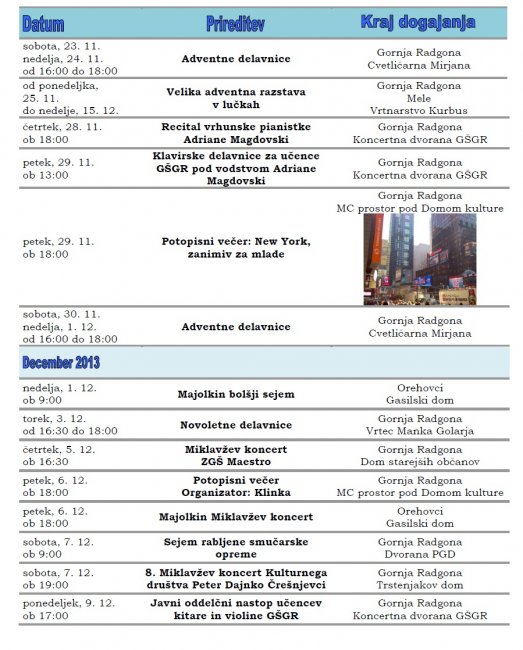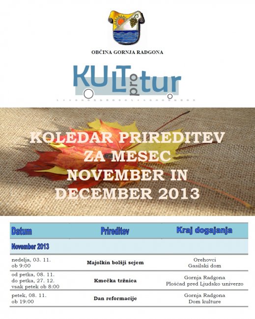 Prireditve, ki se bodo v mesecu novembru in decembru 2013 odvijale v občini Gornja Radgona so razvidne iz priponke spodaj: