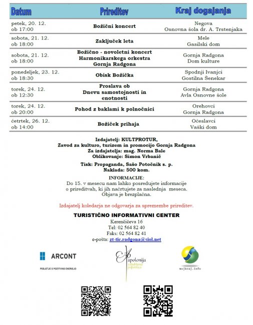 Koledar prireditev v tiskani obliki se lahko dobi v TIC-u, na občini, v Domu kulture in na drugih mestih v Gornji Radgoni.