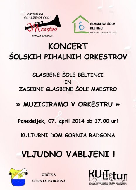 Koncert šolskih pihalnih orkestrov Glasbene šole Beltinci in ZGŠ Maestro "MUZICIRAMO V ORKESTRU" - 7. aprila 2014 v Domu kulture Gornja Radgona
