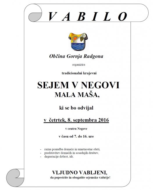 Tradicionalni krajevni SEJEM V NEGOVI - MALA MAŠA - 8. septembra 2016