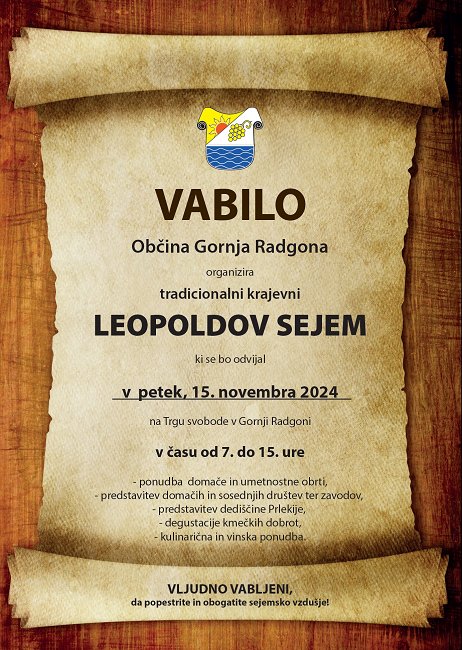 Občina Gornja Radgona v petek, 15. novembra organizira vsakoletni Leopoldov sejem na Trgu svobode v Gornji Radgoni.