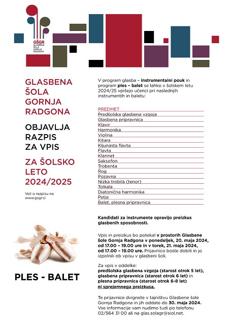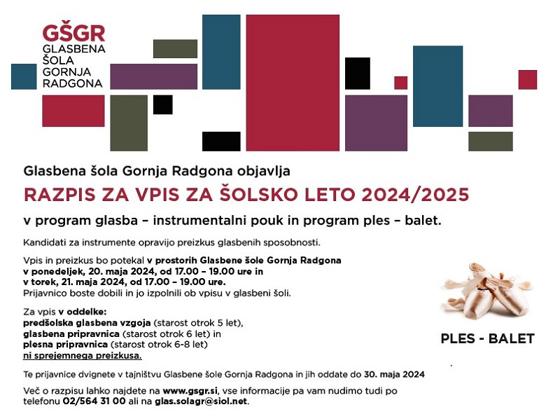 Obvestilo - Glasbena šola Gornja Radgona objavlja razpis za vpis za šolsko leto 2024-2025