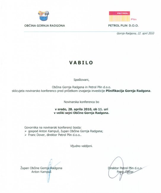 Novinarska konferenca pred pričetkom izvajanja investicije Plinifikacija Gornja Radgona - 28. aprila 2010 v Gornji Radgoni