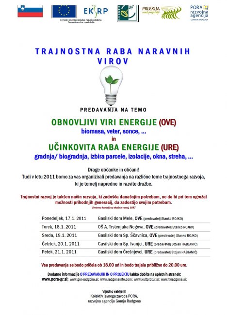 Trajnostna raba naravnih virov – Brezplačna predavanja na temo obnovljivi viri energije (OVE) in učinkovita raba energije (URE) - od 17. do 21. januarja 2011 v občini Gornja Radgona