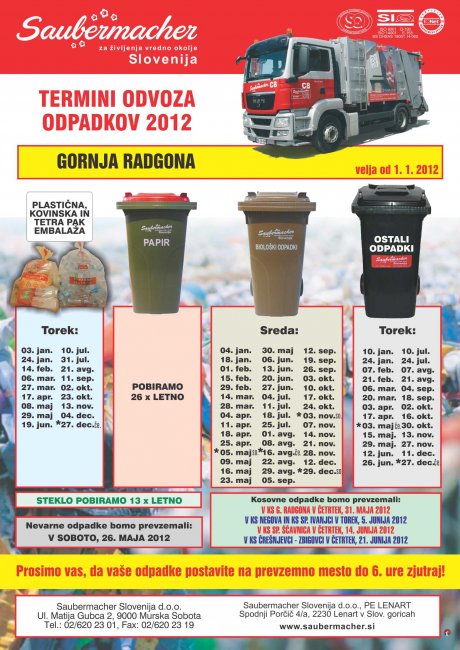 Termini odvoza odpadkov v letu 2012 v občini Gornja Radgona s strani podjetja Saubermacher Slovenija