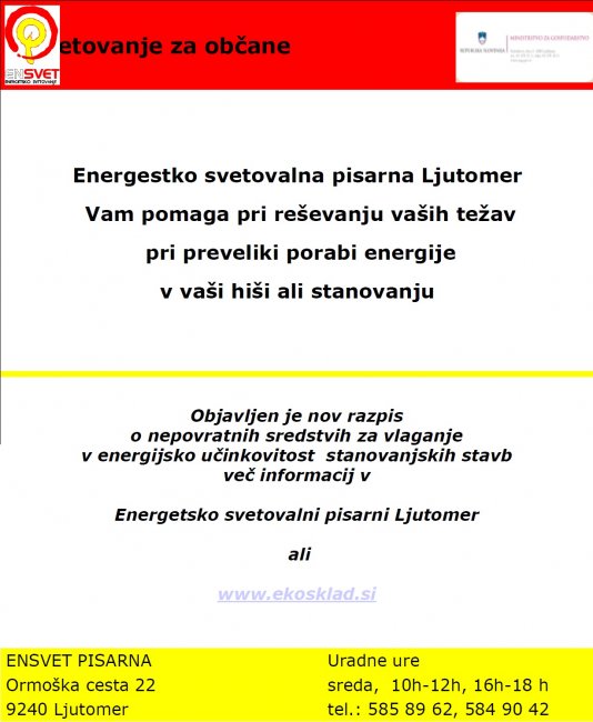 Strokovno, brezplačno in neodvisno energetsko svetovanje za občane in obvestilo o novem javnem razpisu Eko sklada o nepovratnih sredstvih za vlaganje v energijsko učinkovitost stanovanjskih stavb