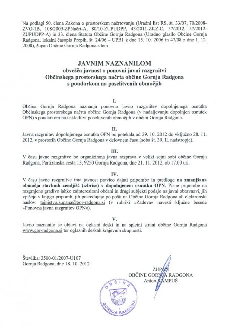 Javna razgrnitev dopolnjenega osnutka OPN bo potekala od 29. 10. 2012 do vključno 28. 11. 2012, v prostorih Občine Gornja Radgona v delovnem času (soba št. 39, II. nadstropje).