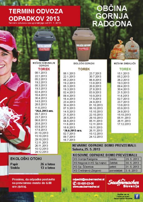 Termini odvoza odpadkov v letu 2013 v občini Gornja Radgona s strani podjetja Saubermacher Slovenija