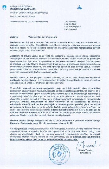 Obvestilo o reorganizaciji davčne uprave in vzpostavitvi Davčne pisarne Gornja Radgona v upravni zgradbi Občine Gornja Radgona od 1. 7. 2013 dalje