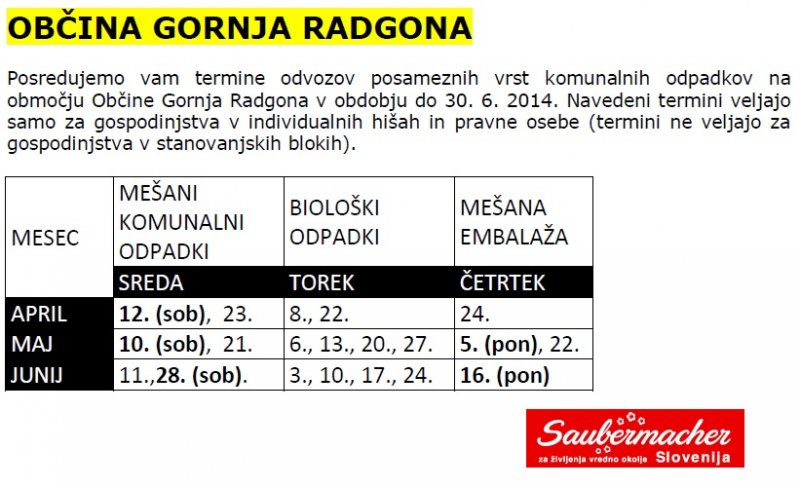 Termini odvoza odpadkov v občini Gornja Radgona s strani podjetja Saubermacher Slovenija do 30. 6. 2014
