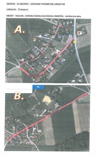 Obvoz bo zagotovljen po občinski javni poti JP 605506 Črešnjevci – domačija Iskra in JP 605508 Črešnjevci – 605506 (na skici označena kot popolna zapora »A«).