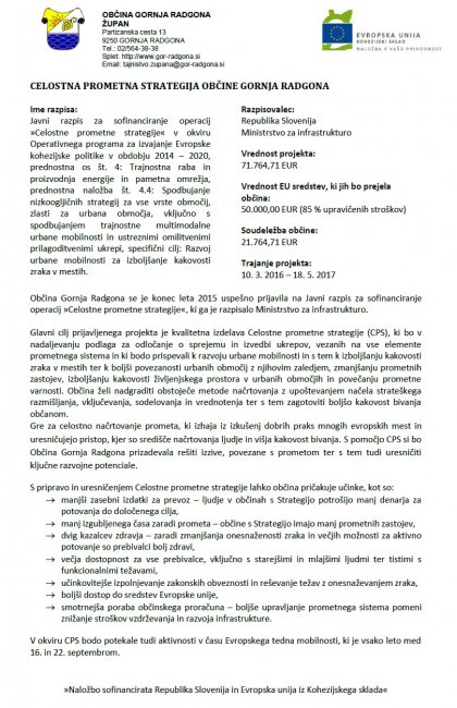 Občina Gornja Radgona se je konec leta 2015 uspešno prijavila na Javni razpis za sofinanciranje operacij »Celostne prometne strategije«, ki ga je razpisalo Ministrstvo za infrastrukturo.