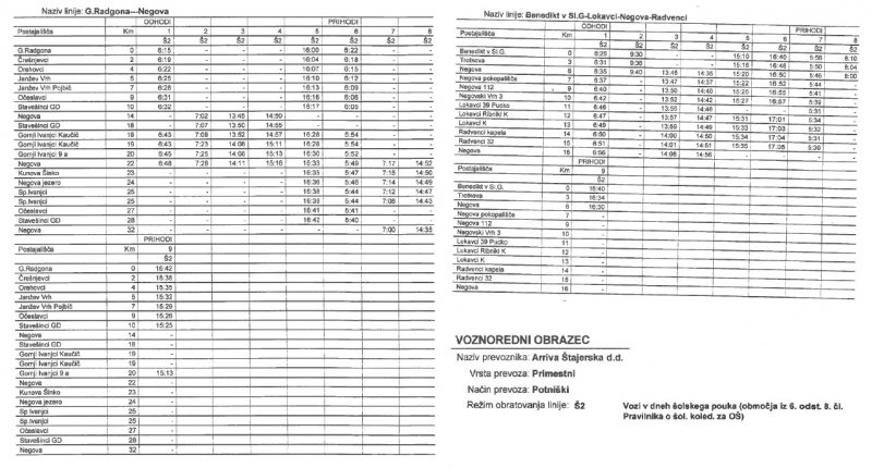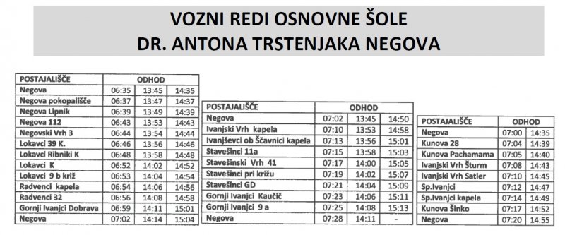 z veseljem vas obveščamo, da se s 1. 9. 2016 pripravlja sprememba pri šolskih prevozih, vezanih na šolski okoliš Osnovne šole dr. Antona Trstenjaka Negova, saj se prehaja na linijski prevoz, ki ga bo opravljalo podjetje Arriva d.d. Maribor. Gre za veliko pridobitev, saj se boste v teh terminih in s tem prevozom lahko vozili tudi ostale občanke in občani, vzpostavljeni pa bosta tudi dve dodatni liniji za povezovanje Negove z Benediktom in Gornjo Radgono, kar je razvidno iz priloženega voznega reda (na drugi strani tega obvestila), katerega pa si lahko ogledate tudi na spletni strani prevoznika www.arriva.si – zavihek vozni redi.
