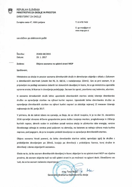 Objava seznama dimnikarskih družb in dimnikarjev v skladu z Zakonom o dimnikarskih storitvah