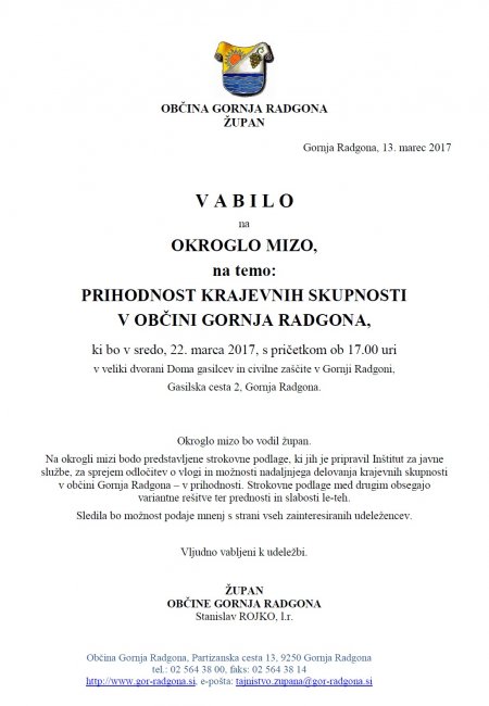Na okrogli mizi bodo predstavljene strokovne podlage, ki jih je pripravil Inštitut za javne službe, za sprejem odločitev o vlogi in možnosti nadaljnjega delovanja krajevnih skupnosti v občini Gornja Radgona – v prihodnosti. Strokovne podlage med drugim obsegajo variantne rešitve ter prednosti in slabosti le-teh.